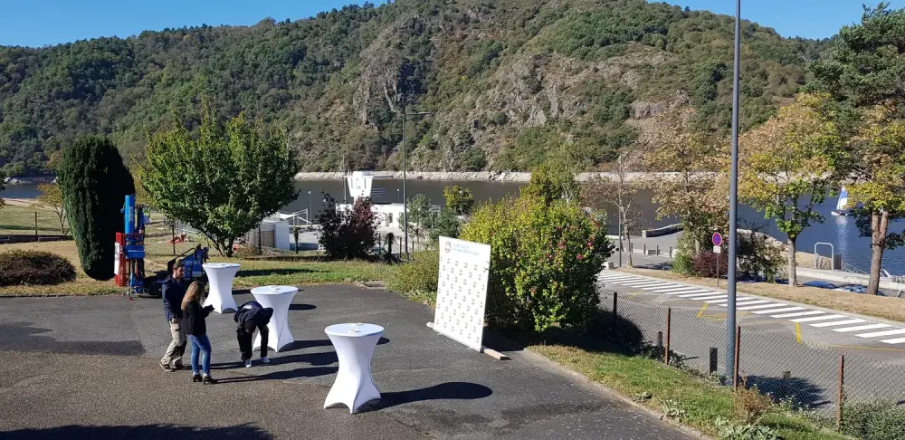 La salle de réception lumineuse, avec ses larges baies vitrées et ses belles poutres apparentes, est parfaitement adaptée pour accueillir vos conférences et séminaires. Le cocktail ou les pauses-café peuvent être organisés sur la terrasse ou sous la voile d'ombrage, offrant une vue imprenable sur le Lac de Grangent, propice à la détente et aux échanges professionnels.